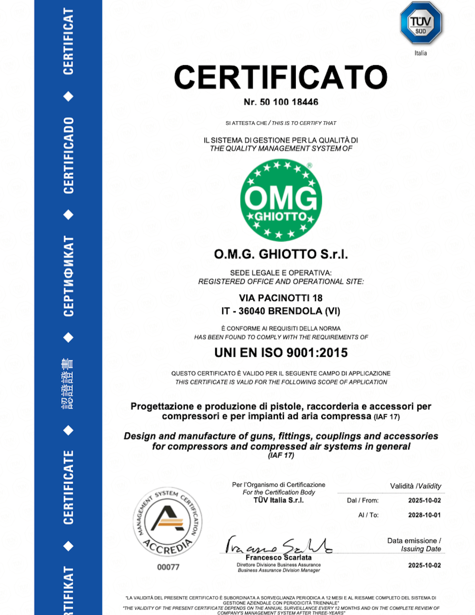 Its materials are purchased from prime industry suppliers and are generally accompanied by the appropriate certification stating compliance with standard EN 10204. At the end of the manufacturing process, the finished products are tested using appropriate internal standards. As a result, O.M.G. GHIOTTO S.R.L. is able to provide – upon request – the suitable certification required by the European directives.